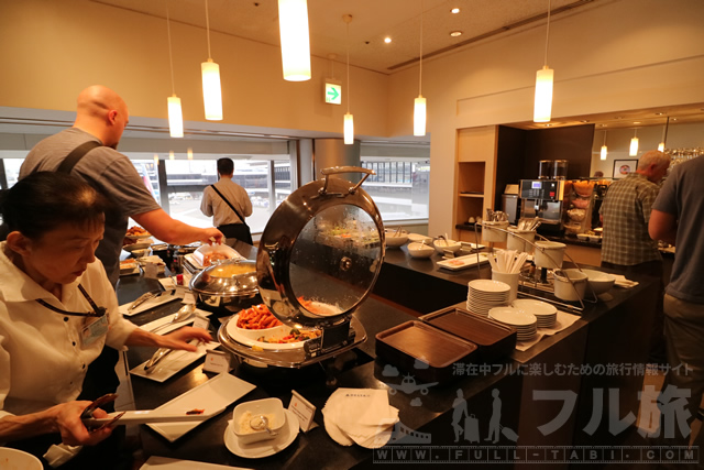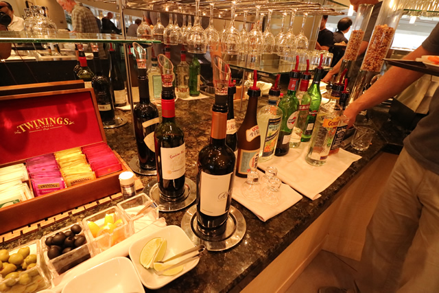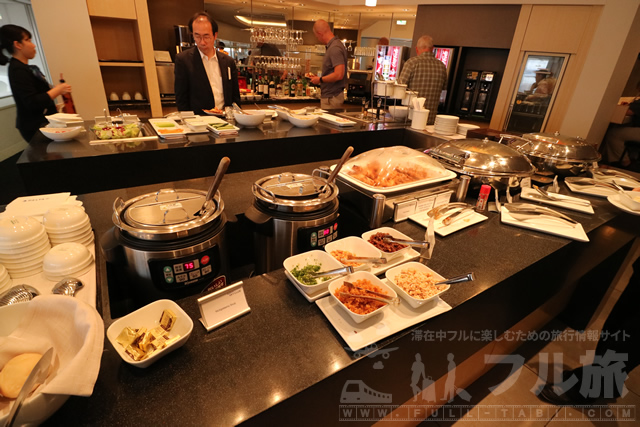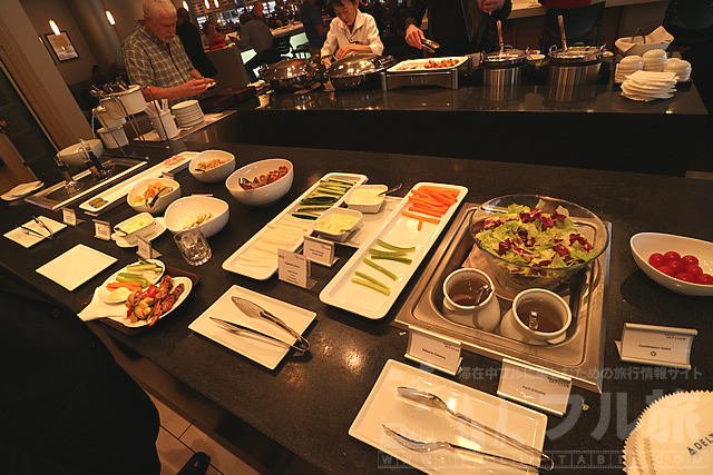 やや圧迫感のあるフードエリア。サラダ、温かい食事、つまみ、軽いデザート、ソフトドリンク、アルコールが一通り揃っています。