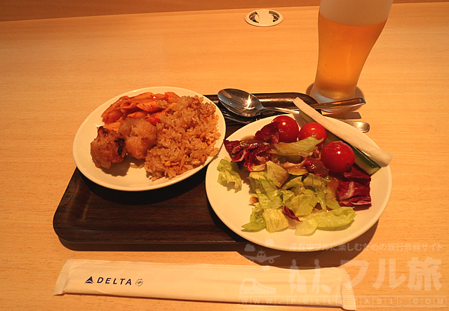 ということで今回のラウンジ食は、チャーハン、唐揚げ、ペンネ、サラダ、そしてビールです。すべて濃い味系のフードですが見た目よりもまあまあ普通のレベルに濃さは抑えられているかな。軽食程度に食べるのが良さそうです。