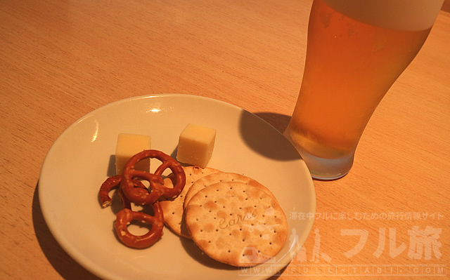そして時間ももうなくなってきたので急いでビールをおかわりし、おつまみのスナックも持ってきました。食事が合わない方はスナックやチーズ類も色々あるのでこちらとお酒でラウンジを過ごすのもよいと思います。