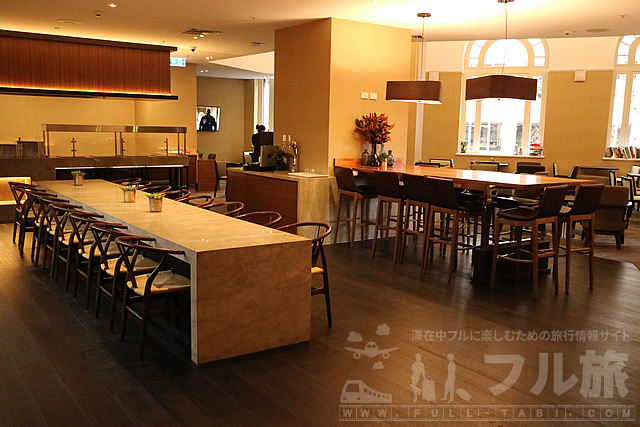 中に入るとかなり広めのラウンジで驚きました。大きな長テーブルが2つ。奥のカウンターは時間帯によって食事が並ぶカウンターです。ここまで広々としたラウンジも珍しいのではないかと思います。