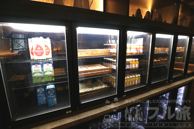 冷蔵庫には上の段にミルクやレッシュジュースなどが入っていました。お酒やヨーグルトなどもありましたが、ここは開きませんでした。スタッフに言うと、今の時間帯は飲み物だけだけど、特別に、ということでヨーグルトもいただきました。