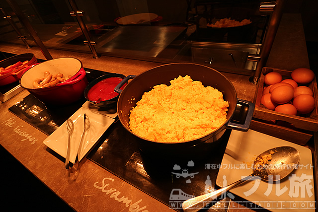 ゆで卵、スクランブルエッグ、ソーセージ、ベーコンなど。アメリカンなブレックファストメニューですね。