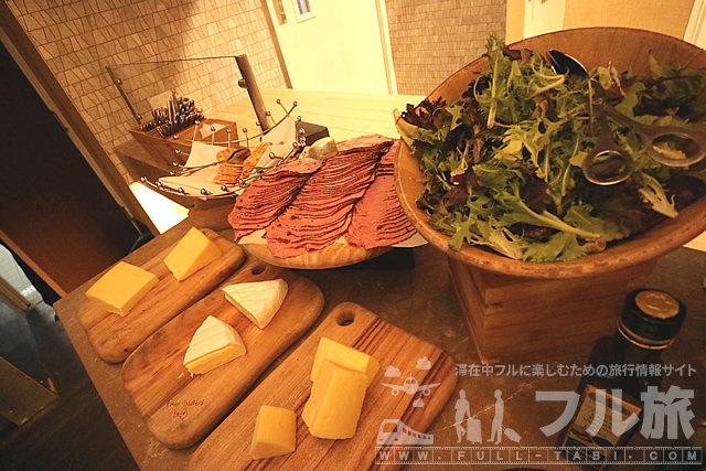 クラッカー、チーズ、ハム、野菜、パンなどが並びます。
