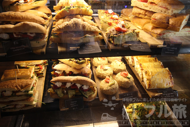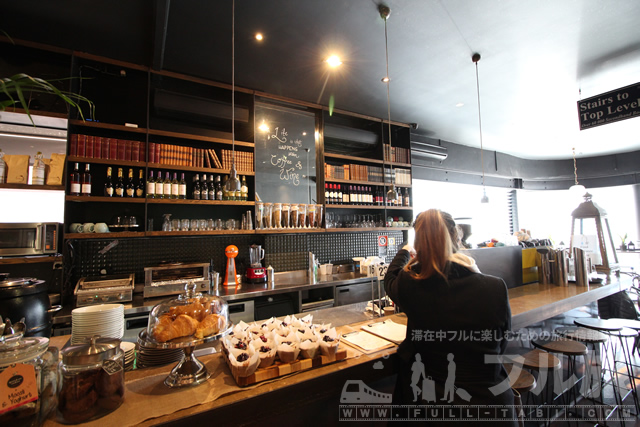 カフェエリアはこのようになっていてコーヒー等の飲み物とお酒、パンやケーキなどの軽食を買うことができます。もちろん買ったものはここでゆっくりと食べられます。