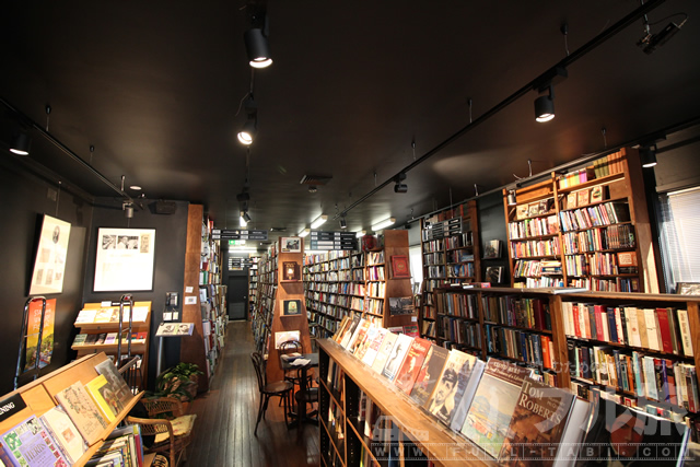 1階の奥はこのように黒い天井にぎっしりと詰まった本。